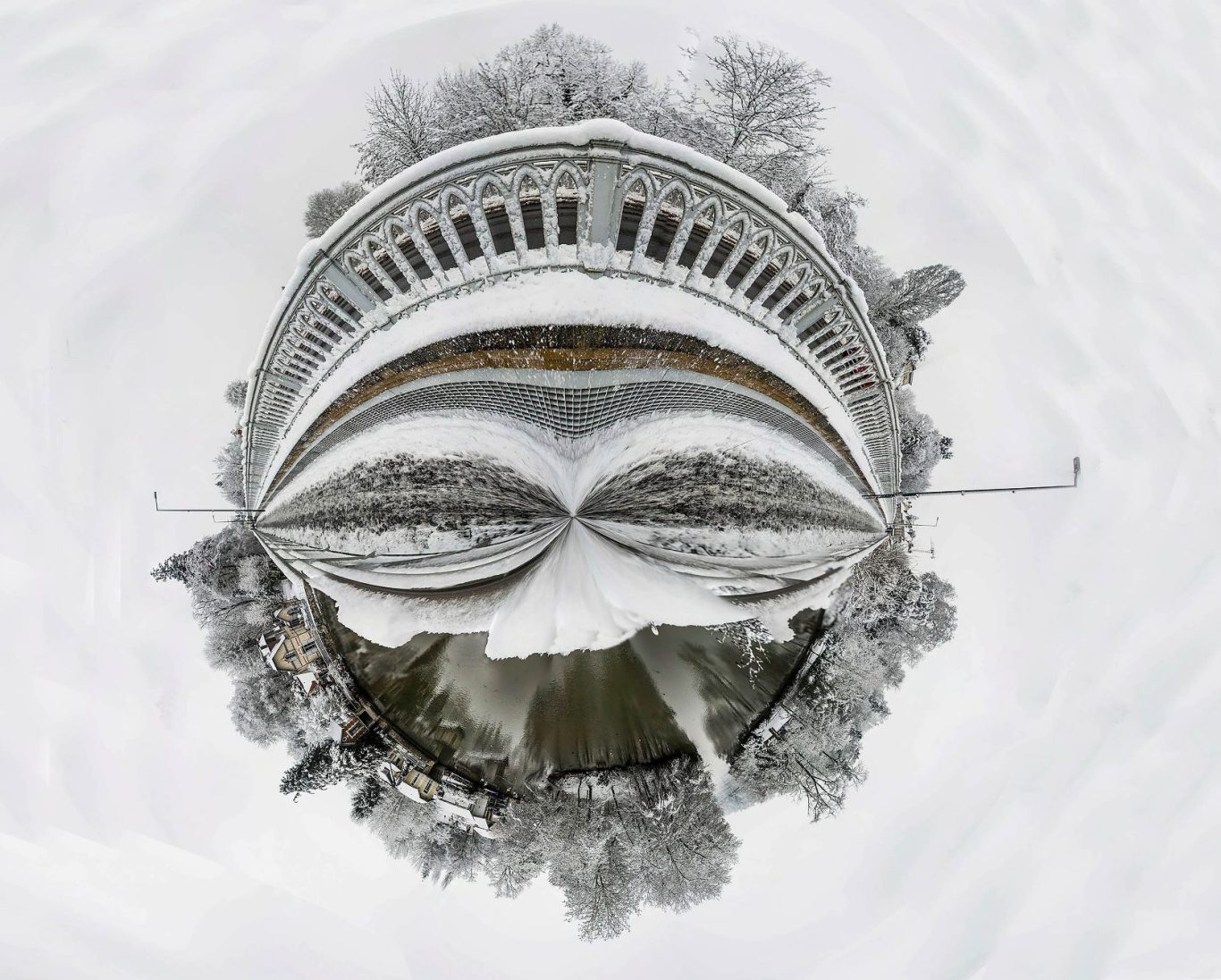 Vue du pont du Maréchal Leclerc entièrement recouvert de neige. Ses arches forment un cercle parfait au centre, entouré d’arbres givrés et du reflet sombre de l’eau, créant un petit monde hivernal et poétique.